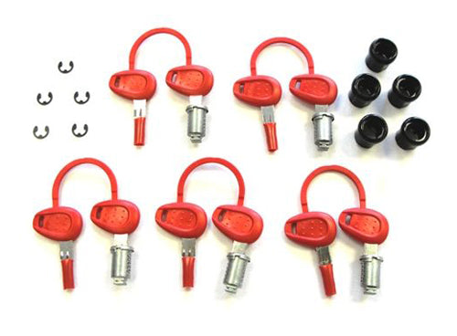 Givi lock sets include 2 keys per lock cylinder to re-key select Givi cases. The kits are easy to install using a small screwdriver. Keys are red and the lock cylinder housings are black.